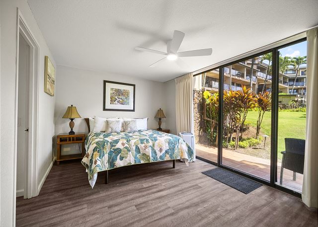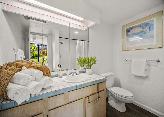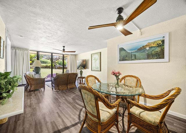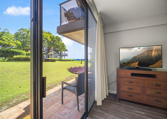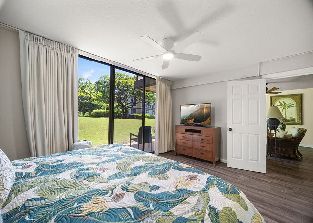 The fully equipped kitchen has everything you need to prepare meals, complete with modern appliances and cookware. The living room includes a comfortable sofa, TV, and sliding doors that open to your private lanai, where a lava rock wall separates you from the pool area, just steps away for a refreshing dip.