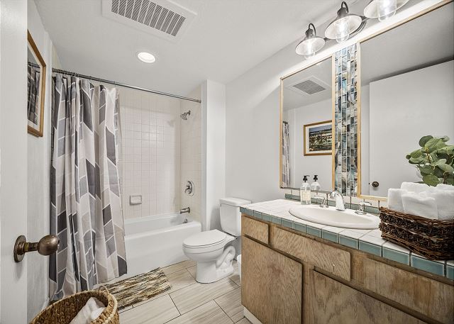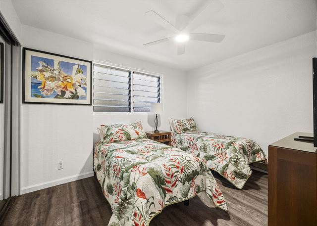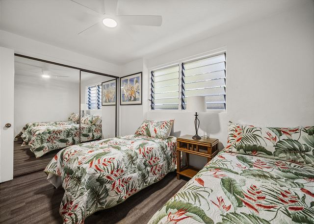 The air conditioned master bedroom is located on the ocean side of the unit and features a king bed with ensuite bathroom, and lanai access for those morning coffee moments by the sea. The second bedroom offers two twin beds, ideal for families or friends traveling together. An additional queen aerobed is available in the living area for extra guests.